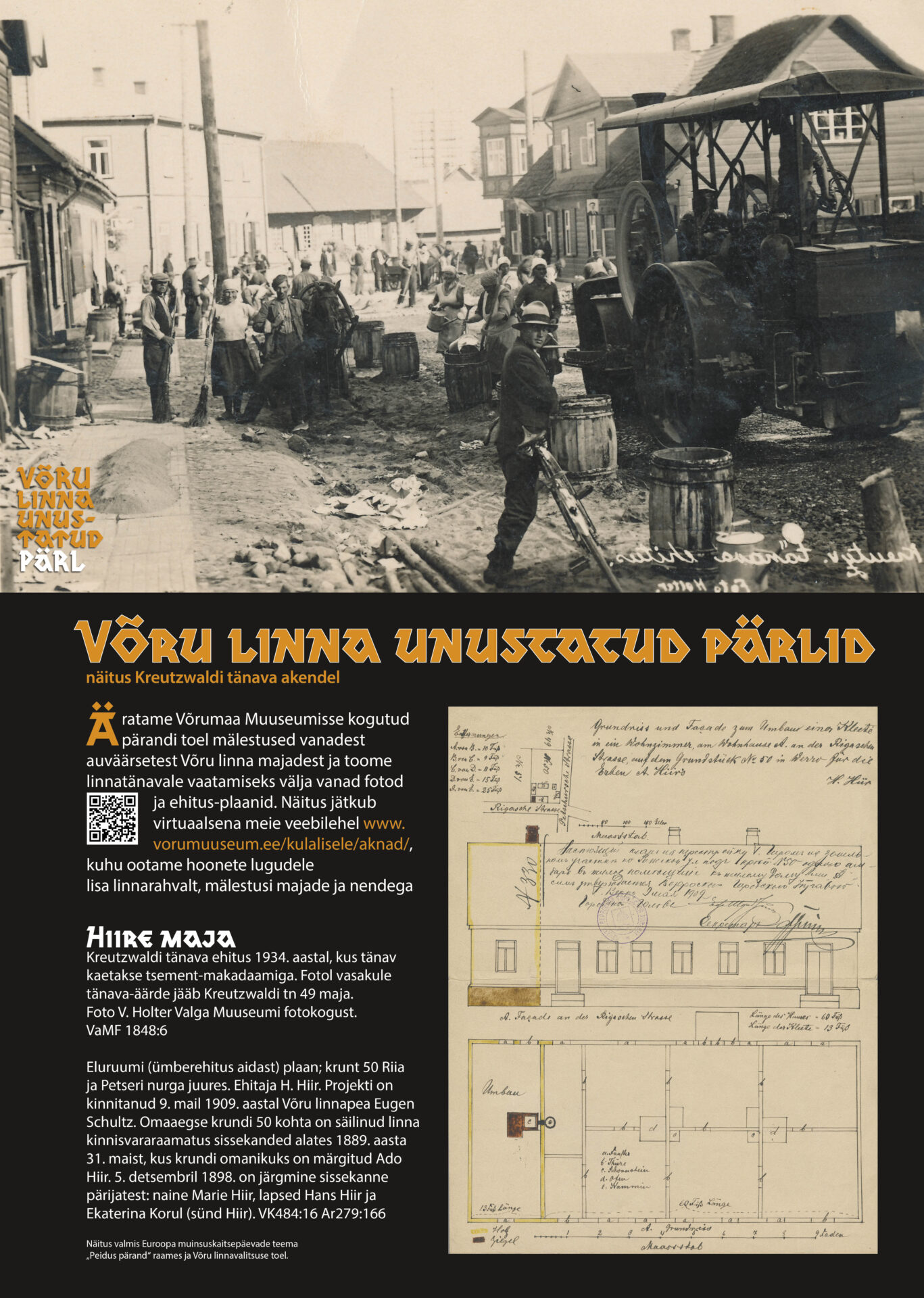Näitus on osa ettevõtmisest “Võru linna unustatud pärlid”, kus äratasime mälestused vanadest kaunitest Võru linna majadest Võrumaa Muuseumisse kogutud pärandi toel ja tõime linnatänavale vaatamiseks välja vanad fotod ja ehitusplaanid. Loe enam ka teiste majade kohta: