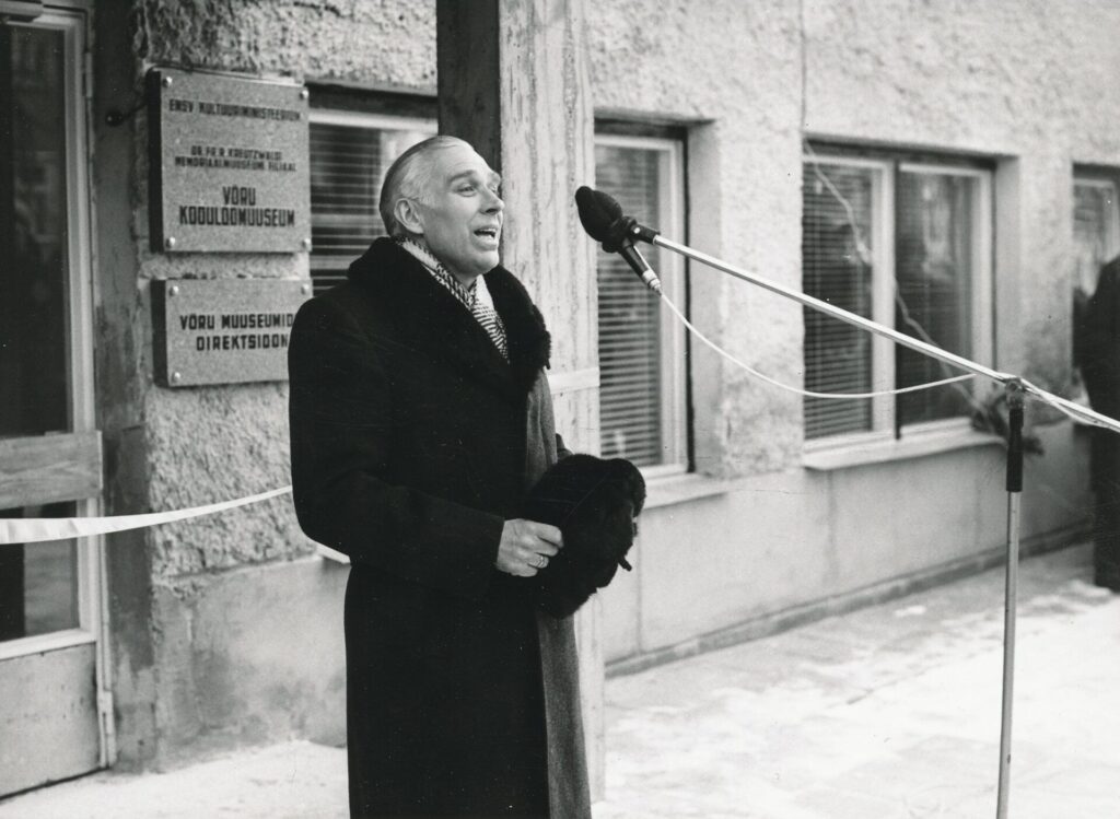 Võru Koduloomuuseumi hoone avamisel 10. veebruaril 1983. aastal kõneleb muuseumi direktor Aleksander Krull